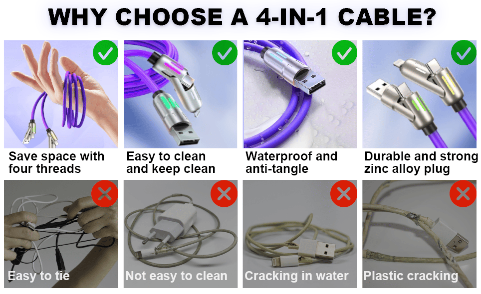 ✅ Space-Saving All-in-One:4 connectors in one cable, say goodbye to messy wires, super easy to organize