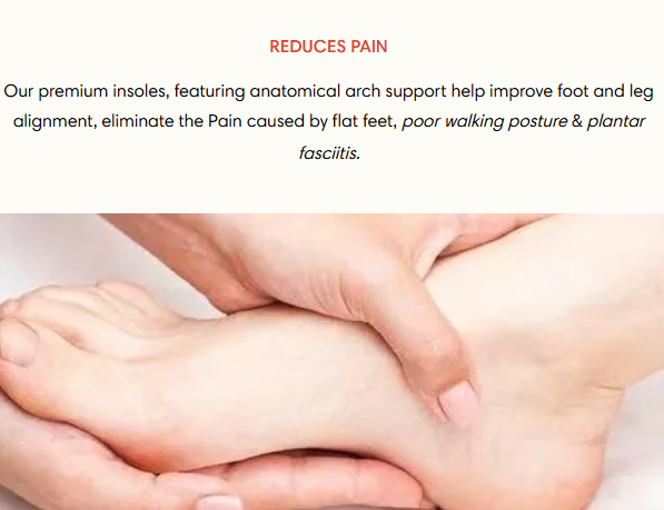 Our premium insoles, featuring anatomical arch support help improve foot and leg alignment, eliminate the Pain caused by flat feet, poor walking posture & plantar fasciitis.