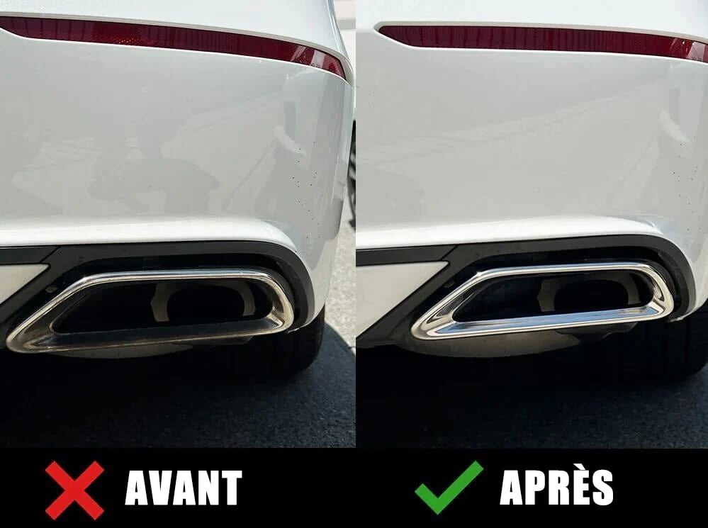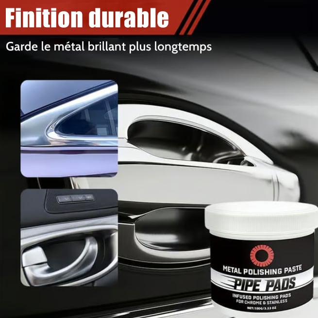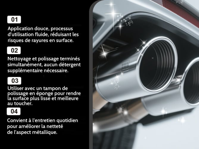 Élimine sans effort l'oxydation superficielle, la décoloration et la saleté des tuyaux chromés, des pots d'échappement, des roues et des pare-chocs.