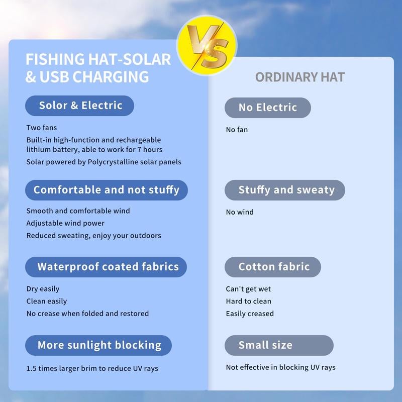 🧢 Upgraded Solar Fan Hat: Stay cool hands-free with dual mini fans (5000 RPM, 3-speed, 7-blade) built directly into the brim—powerful airflow for your face and neck wherever you go.