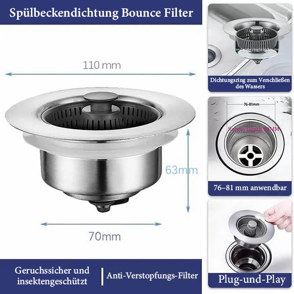 Mit seinen Funktionen zur Wasserspeicherung, Verhinderung von Verstopfungen und Geruchskontrolle ist dieses innovative Abflusssieb Sieb, Stöpsel und Geruchsfilter in einem und sorgt dafür, dass Ihr Küchenspülbecken frei von Verstopfungen durch Speisereste bleibt.