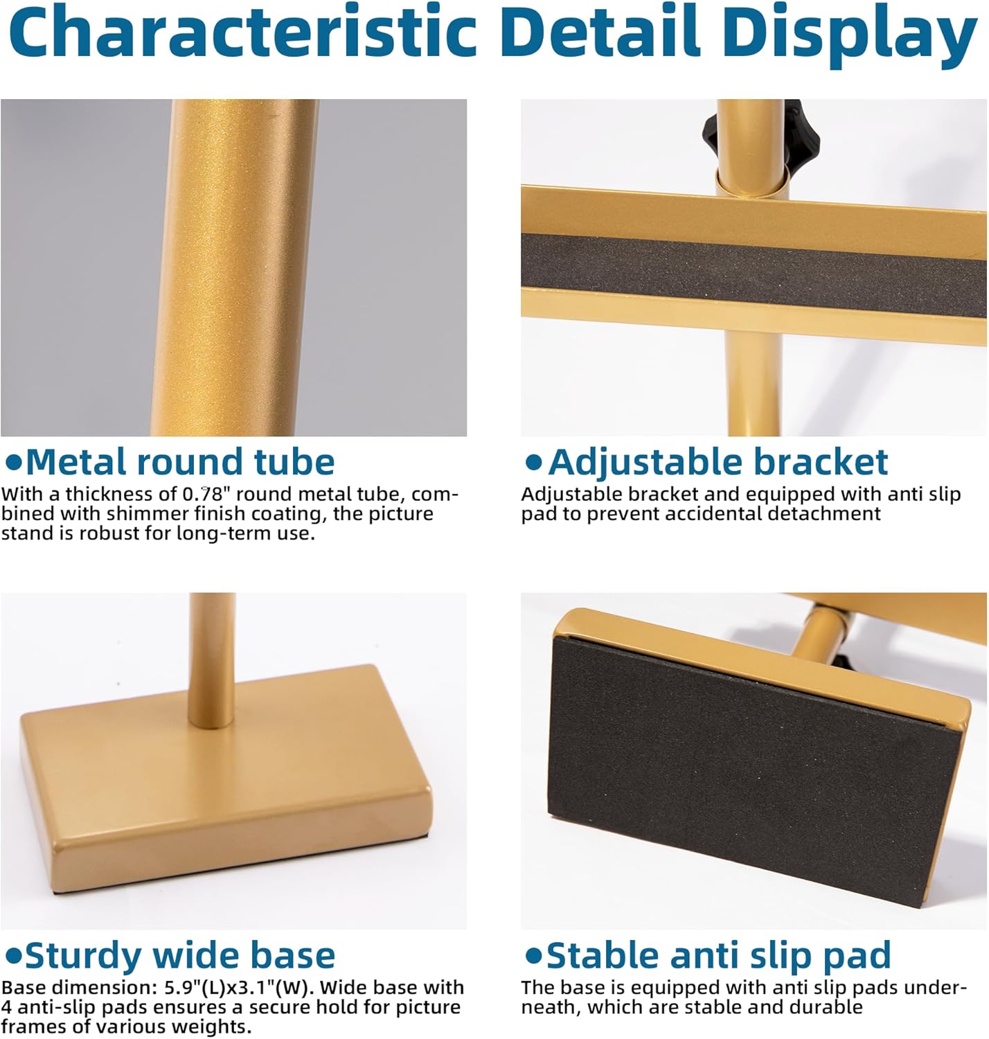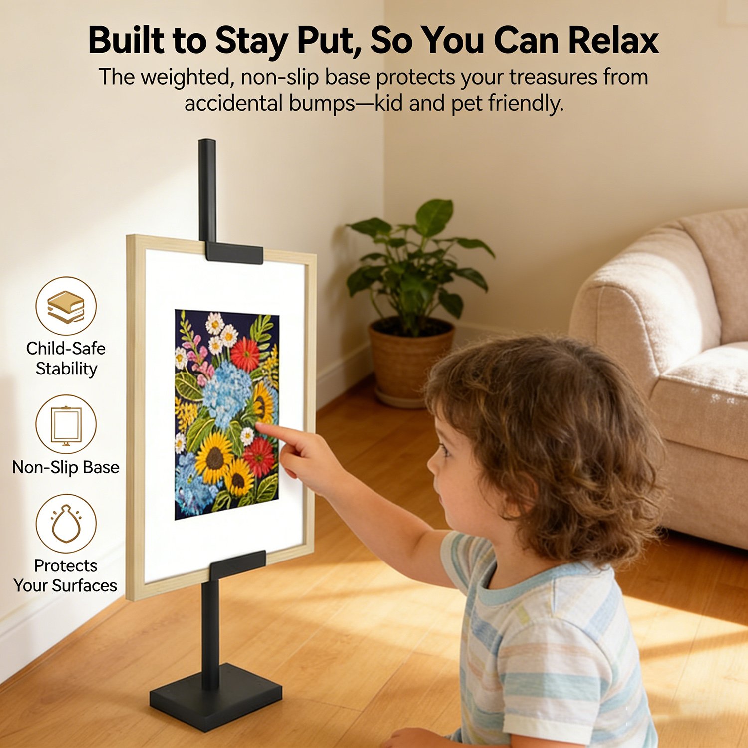 The weighted metal base combined with non-slip foam pads creates a solid foundation that prevents tipping and sliding. Your valuable frames stay securely in place on any surface, from glass tables to wooden shelves, giving you complete peace of mind.