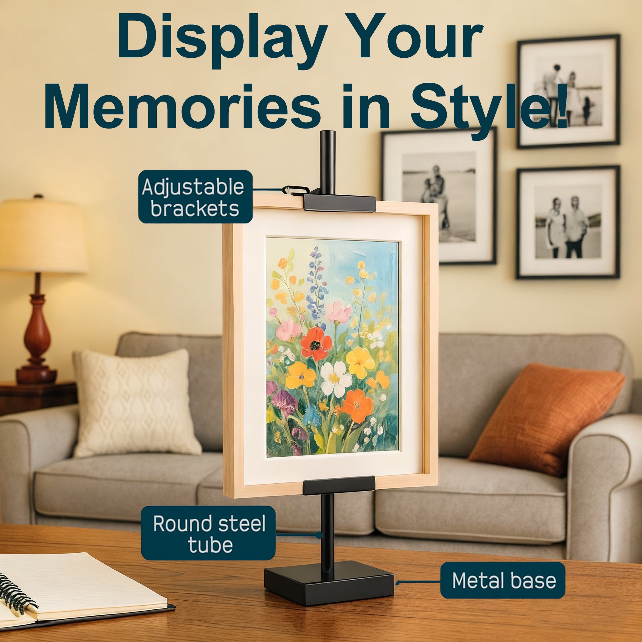 Showcase your favorite photos, artwork, and signs with elegance and stability using our premium tabletop easel stand. Designed for both horizontal and vertical formats, this sturdy metal easel brings gallery-style presentation to your home, office, or studio - transforming how you display life's precious moments!