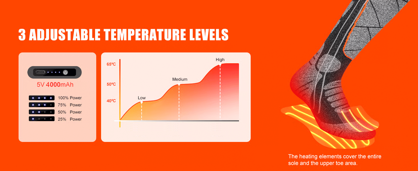 Experience ultimate comfort in freezing weather with our rechargeable heated socks-perfect for skiing, hiking, and winter adventures. No more cold feet - just lasting warmth powered by two 4000mAh batteries.