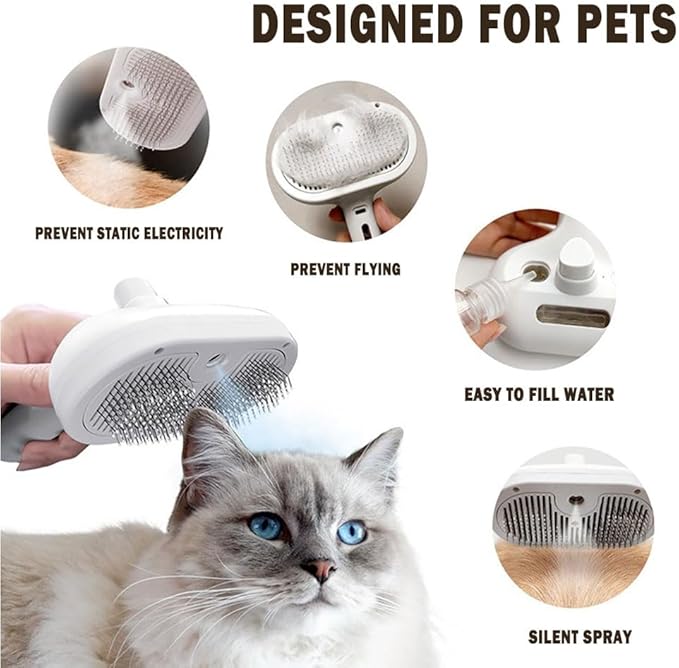 Easy to Use: The cat hair brush is easy to set up,zero assembly. This spray brush with a push of a mist release button puts out just enough steam to keep flyaway hairs at bay. It is versatile and suitable for both dogs and cats.