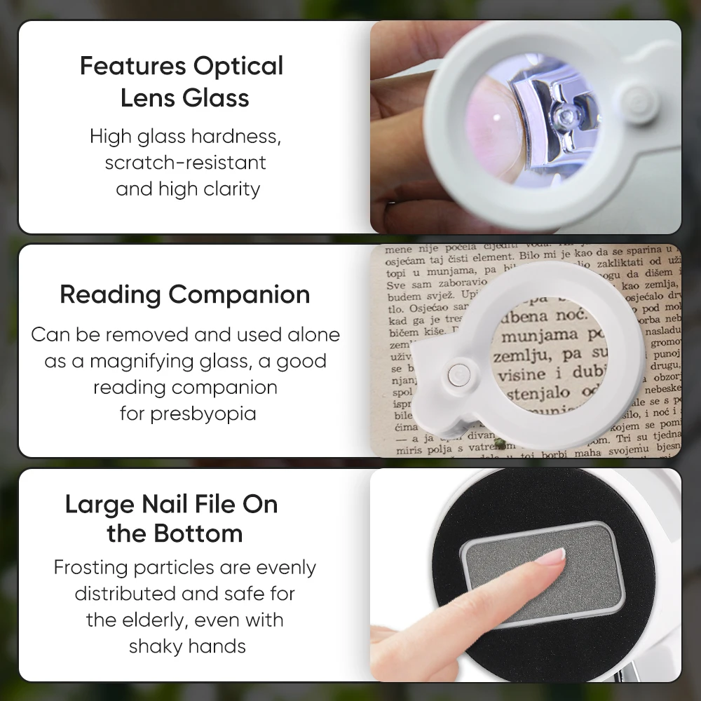 The LED light illuminates your nail area for better visibility. No shadows or dark spots, making trimming safe and precise.