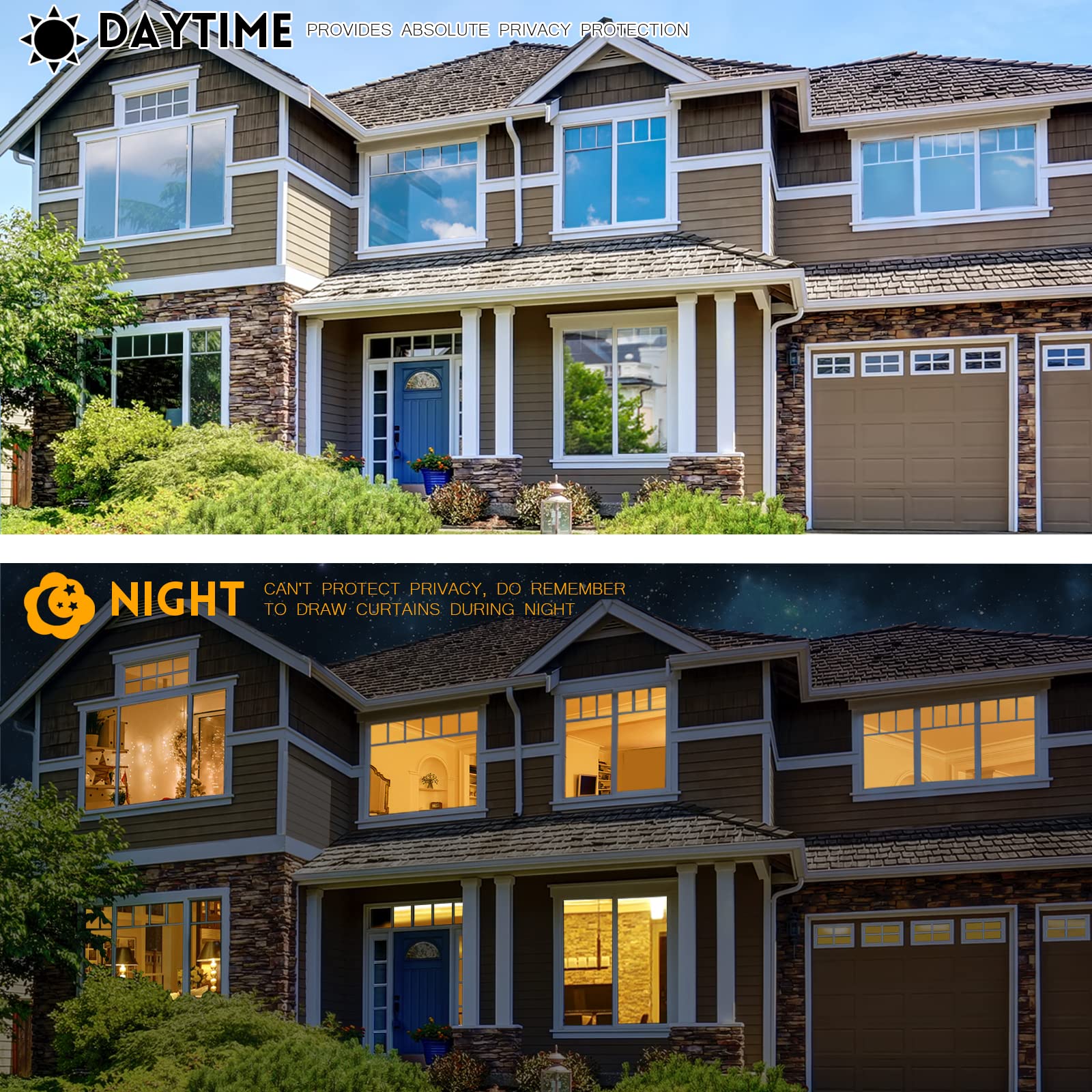 DAYTIME PRIVACY PROTECTION: This one way window film ONLY provides superb privacy during the daytime, the mirror reflection design of privacy control window film allows others to not see any of your interior from the outside, effectively protect your private space.But when the inside light is stronger than outside, such as the lights turn on, the mirror effect will disappear and the inside will be seen from outside. So at night with this mirror tint, it is necessary to draw the curtains.