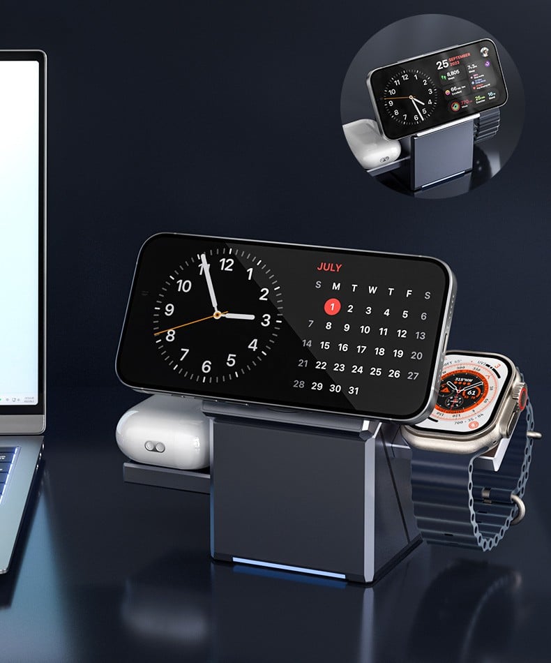 ✅3-in-1 Wireless Charging: Simultaneously charges phone, watch, and earbuds without extra cables