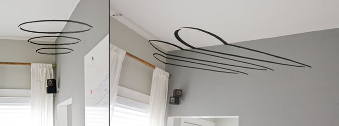 An early anamorphic illustration, painted in my house in 2017. (Thanks Isaac!) From anywhere else, it's just a tangle of lines — but stand in the right spot, and everything clicks into place.